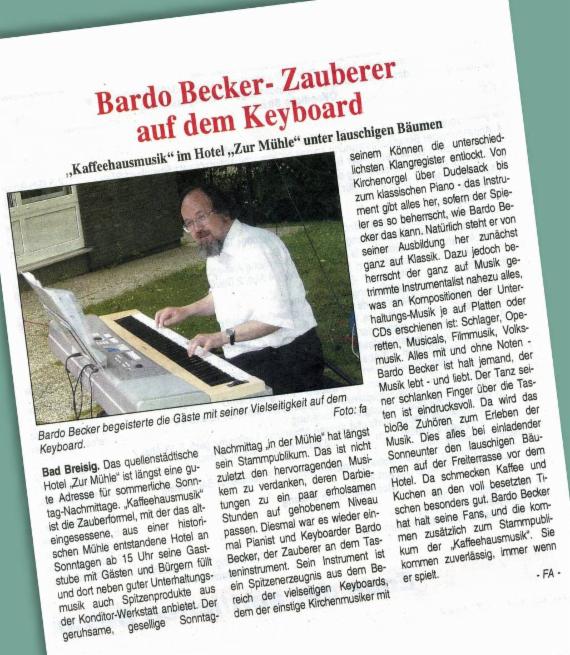 " . . .Das Besondere an diesem festlich gestalteten Jubiläums-Brunch war zum einen die musikalische Darbietung durch Bardo Becker, den neuen Chorleiter der Männerchorgemeinschaft Mendig, der seine musikalischen Fähigkeiten an einem nagelneuen E-Piano auf das Angenehmste unter Beweis stellte . . . Seine "Premiere" als Unterhaltungskünstler gestaltete er mit dezenter, gediegener Musik. . . . Bis hin zu Wiener Schmankerln beherrscht er ein umfangreiches Repertoire, das die Gäste immer wieder mit anerkennendem Applaus honorierten."